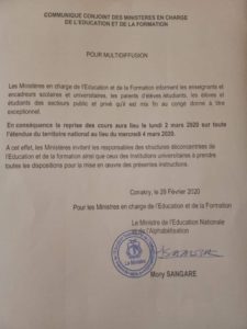 GUINEE- reprise des cours a partir du lundi 02 mars, sur toute l’étendue du territoire nationale (communiqué) !