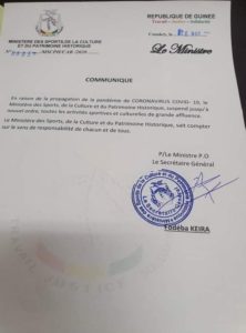 GUINEE/ CORONAVIRUS- le ministère des sports de la culture, suspend jusqu’à nouvel, toutes les activités sportives et culturelles de grande affluence (communiqué) !