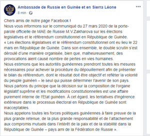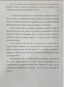 Nous appelons toutes les forces politiques guinéennes à faire preuve de la plus grande retenue, de la plus grande responsabilité et de l’attachement aux compromis mutuels dans l’intérêt de la paix et de la stabilité dans la République de Guinée – pays ami de la Fédération de Russie »
