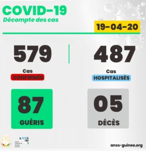 Ce dimanche 19 avril 2020, la Guinée vient d’enregistrer 61nouveauxcasconfirmés. La Guinée passe désormais à (579) casconfirmés depuis le début de la pandémie sur son sol et 79personnes et (5) décès