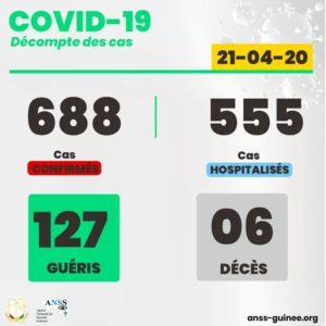 Ce mardi 21 avril 2020, la Guinée vient d’enregistrer 66 nouveaux cas confirmés. La Guinée passe désormais à (688) cas confirmés depuis le début de la pandémie sur son sol dont 127 personnes guéris et (6) décès