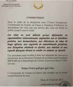 Réplique du berger à la bergère ! La Guinée applique le principe de la réciprocité et ferme son service visas de sa représentation diplomatique en France, aux ressortrissants de l’Union européenne, désireux de se rendre sur son territoire. Et ce jusqu’à nouvel ordre.