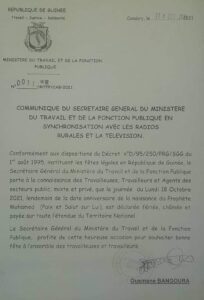 Le secrétaire général du ministère de la fonction publique informe les travailleurs de Guinée que le lundi 18 octobre, lendemain de la naissance du prophète Mohammad, est déclaré férié, chômé et payé sur toute l’étendue du territoire national, conformément aux dispositions du décret du 1er Aout 1995.