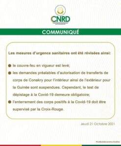 Dans un communiqué, le CNRD a levé le couvre-feu qui courait jusque-là de 00h à 4 heures du matin et suspendu les demandes préalables d’autorisation de transfert de corps de Conakry pour l’intérieur et l’extérieur du pays.