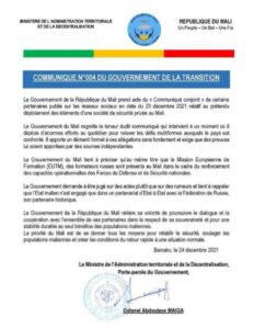 Première réaction des autorités de la transition malienne au communiqué des 15 pays occidentaux partenaires du Mali sur la présence de Wagner dans le pays. Ce vendredi 24 décembre à Bamako, s’est tenu un conseil supérieur de défense national autour du président de la transition, le colonel Assimi Goïta. La situation sécuritaire ainsi que l’évolution des mesures à apporter notamment face à la réorganisation du dispositif de Barkhane ont été évoqués. En marge de cette réunion, les autorités ont dans un communiqué lu à la télévision national vivement démenti les « allégations de quelques partenaires » sur la présence de la société russe Wagner.