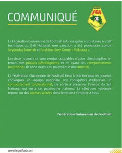 Dans un communiqué rendu public ce jeudi 20 janvier 2022. La Fédération Guinéenne de Football informe qu’en accord avec le staff technique, une sanction a été prononcée contre Saydouba Soumah et Ibrahima Sory Conté. Les deux joueurs se sont rendus coupables d’actes d’indiscipline en tenant des propos désobligeants et en ayant des comportements inappropriés. La FEGUIFOOT informe que ces deux joueurs sont soumis au paiement d’une amende.