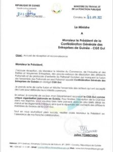 Dans un courrier réponse en date du 08 avril 2022 adressé au président de la CGE-Gui, le ministre du travail et de la fonction publique note avoir pris acte de la fusion entre les différents patronats en un seul appelé dorénavant Confédération Générale des Entreprises de Guinée (CGE-Gui).