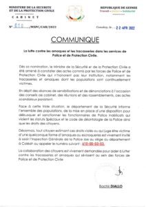 Le ministre Bachir Diallo à travers un communiqué dont nous disposons copie, tout citoyen estimant que ses droits sont violés ou qui juge être victime d’une quelconque forme d’arnaque ou escroquerie de la part d’un agent de la police, a la possibilité de se plaindre