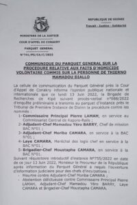 La brigade de recherche de Kipé a transmis, ce lundi 13 juin 2022, au parquet d’instance du tribunal de première instance de Dixinn la procédure judiciaire contre les présumés auteurs de l’assassinat du jeune Thierno Mamadou Diallo, fauché par balle en marge d’une manifestation contre le réajustement du prix du carburant.