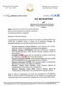 Dans un courrier en date de ce 22 juillet 2022, le ministre Wright demande au procureur général près la cour d’appel de Conakry d’engager des poursuites contre l’ancien patron du département de la justice et six personnes pour des faits présumés de corruption, concussion, enrichissement illicite et complicité.