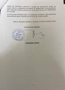 Dans un communiqué publié le mardi 08 novembre 2022, le procureur général près la cour d’appel de Conakry annonce avoir instruit le procureur de la république près le TPI de Kaloum le lundi 07 novembre d’engager des poursuites par la saisie d’une unité de police spécialisée en enquêtes financières pour des fins d’enquêtes contre les mis en cause.