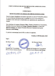 Dans un communiqué rendue public ce jeudi, 08 décembre 2022. L’union des jeunes orpailleurs de Guinée, regroupés au sein de l’UNAJOG sollicite le renouvellement du Bureau dont le mandant est arrivé non seulement à l’échéance mais aussi qui ne répond plus aux aspirations des orpailleurs de Guinée.