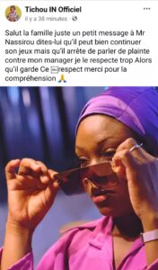 L’artiste nigérienne Tichou a mis en garde le jeune guinéen Mamadou Nassirou Diallo contre les menaces contre son manager. Sur son compte Facebook, la star du Niger, celle qui a chanté pour le commandant Aboubacar Toumba Diakité, en vantant sa bravoure a dit que Nassirou qui demande sa main en mariage pour être sa 3è épouse « peut bien continuer son jeu, mais qu’il arrête de parler de plainte contre mon manager »