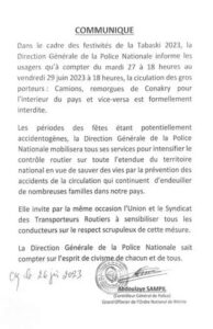 La Direction Générale de la Police Nationale informe les usagers qu’à compter du mardi 27 à 18 heures au vendredi 29 juin 2023 à 18 heures, la circulation des gros porteurs: camions, remorgues de Conakry pour l’intérieur du pays et vice-versa est formellement interdite.