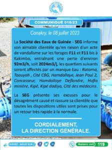 La Société des Eaux de Guinée – SEG informe son aimable clientèle qu’en raison d’un acte de vandalisme sur les forages F11 et F11 bis à Kakimbo, entraînant une perte d’environ 92m3/h, soit 2024m3/j, les quartiers suivants seront affectés par un manque Eau :