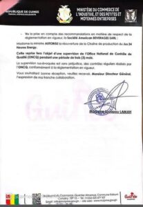 La prise en compte des recommandations en matière de respect de la règlementation en vigueur par la Société American BEVERAGES SARL justifierait cette reprise qui devrait faire l’objet d’une supervision de l’Office National de Contrôle de Qualité (ONCQ) pendant une période de trois (3) mois.