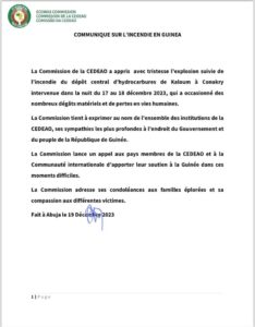 L’incendie du dépôt principal d’hydrocarbures ayant coûté la vie à 18 personnes (bilan encore provisoire) et des dégâts matériels énormes à Kaloum fait réagir l’organisation sous-régionale.