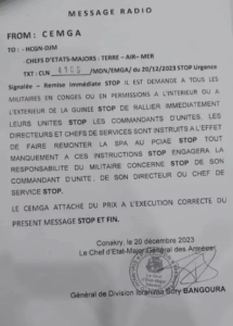 Dans un message radio transmis aux chefs d’Etats-majors des armées de terre, air et mer, le général de division Ibrahima Sory Bangoura a demandé à tous militaires en congé ou ayant une permission à l’intérieur ou à l’extérieur de la Guinée de rallier immédiatement leurs unités.