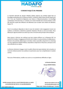 Ce matin du samedi 24 Février 2023. le groupe HadafoMédias vient une nouvelle fois de hausser le ton dans un communiqué parvenu à la rédaction de Mondemedia.info. Annonçant la suspension de l’émetteur FM de ladite radio dans la zone de Conakry. Alors que les raisons derrière ce brouillage restent encore méconnues du grand public.