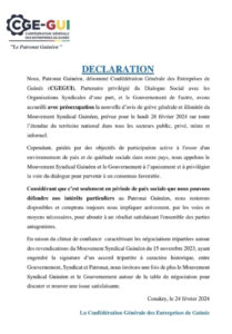 À travers une déclaration, la Confédération générale des Entreprises de Guinée, exprime sa préoccupation quant au mot d’ordre de grève générale illimitée lancé par le Mouvement syndical guinéen. Il invite ce Mouvement à privilégier le dialogue en cette période de crise que traverse le pays.