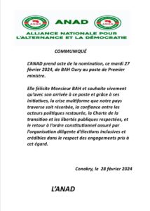 Dans un communiqué parvenu au desk de Siaminfos.com cette nuit, l’Alliance nationale pour l’alternance démocratique (ANAD) a dit prendre acte de cette nomination. Par ailleurs, la coalition dirigée par l’ancien Premier ministre Cellou Dalein Diallo espère la fin des maux qui assaillent la transition guinéenne.