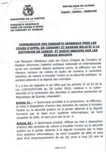 Les Parquets Généraux près les Cours d’Appel de Conakry et Kankan informent en conséquence que des instructions écrites ont été adressées aux procureurs de la République/Juges de Paix de toutes les juridictions du pays, à l’effet d’engager des poursuites judiciaires contre toutes les personnes qui ont produit, diffusé, transmis ou partagé des vidéos et audio obscènes circulant actuellement sur les réseaux sociaux, qui sont de nature à troubler l’ordre ou la sécurité publics qui portent atteinte à la dignité des individus et qui heurtent la morale et la sensibilité du public qui en est exposé.
