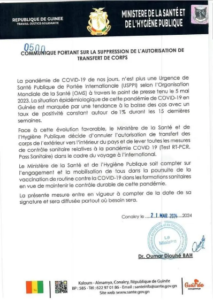 « La pandémie de COVID-19 de nos jours, n’est plus une Urgence de Santé Publique de Portée Internationale (USPPI) selon l’Organisation Mondiale de la Santé (OMS) à travers le point de presse tenu le 5 mai 2023. La situation épidémiologique de cette pandémie de COVID-19 en Guinée est marquée par une tendance à la baisse des cas avec un taux de positivité constant autour de 1% durant les 15 dernières semaines. Face à cette évolution favorable, le Ministère de la Santé et de l’Hygiène Publique décide d’annuler l’autorisation de transfert des corps de l’extérieur vers l’intérieur du pays et de lever toutes les mesures de contrôle sanitaire relatives à la pandémie COVID 19 (Test RT-PCR, Pass Sanitaire) dans le cadre du voyage à l’international. Le Ministère de la Santé et de l’Hygiène Publique sait compter sur l’engagement et la mobilisation de tous dans la poursuite de la vaccination de routine contre la COVID-19 dans les formations sanitaires en vue de maintenir le contrôle durable de cette pandémie. La présente mesure entre en vigueur à compter de la date de sa signature et sera diffusée partout où besoin sera », lit-on dans le communiqué signé du Ministre Dr Oumar Diouhé Bah.