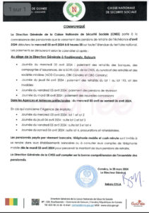 La Direction Générale de la Caisse Nationale de Sécurité Sociale (CNSS) porte à la connaissance des pensionnés que le versement des pensions de retraite de l’échéance d’avril 2024 débutera le mercredi 03 avril 2024 à 8 heures 00 sur toute l’étendue du territoire national.