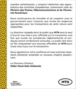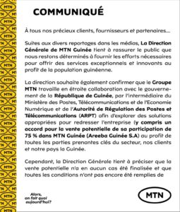 La direction souhaite également confirmer que le Groupe MTN travaille en étroite collaboration avec le gouvernement de la République de Guinée, par l’intermédiaire du Ministère des Postes, Télécommunications et de l’Economie Numérique et de l’Autorité de Régulation des Postes et Télécommunications (ARPT) afin d’explorer des solutions appropriées pour redresser l’entreprise (y compris un accord pour la vente potentielle de sa participation de 75 % dans MTN Guinée (Areeba Guinée S.A) au profit de toutes les parties prenantes clés du secteur, nos clients et notre pays la Guinée.