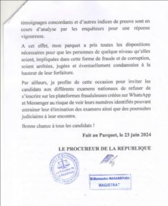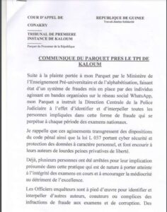 Dans un communiqué lu à la télévision nationale ce lundi 24 juin 2024, le procureur de Kaloum a annoncé des poursuites judiciaires contre les fraudes au baccalauréat.