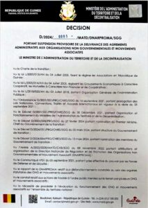Cette mesure s’explique par des dysfonctionnements constatés par le MATD au sein des organes statutaires des ONG et mouvements associatifs et du constat relatif aux actions de trouble à l’ordre public menées sur le terrain par plusieurs ONG et mouvements associatifs.