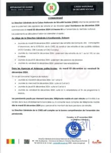 GUINEE- La CNSS annonce le paiement des pensions de retraite et de réversion de décembre 2024 à partir du mardi 03 décembre (Communiqué)
