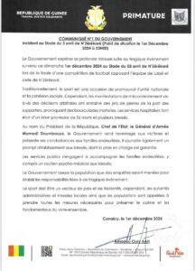 Le Gouvernement exprime sa profonde tristesse suite au tragique événement survenu ce dimanche le 1er décembre 2024 au Stade du 03 avril de N’Zérékoré lors de la finale d’une compétition de football opposant l’équipe de Labé et celle de N’Zérékoré.