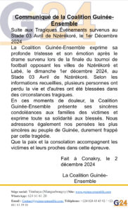La Coalition Guinée-Ensemble exprime sa profonde tristesse et son émotion après le drame survenu lors de la finale du tournoi de football opposant les villes de Nzérékoré et Labé, le dimanche 1er décembre 2024, au Stade 03 Avril de Nzérékoré. Selon les informations recueillies, plusieurs personnes ont perdu la vie et d’autres ont été blessées dans des circonstances tragiques.