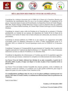Dans une déclaration publiée ce mercredi 25 décembre 2024, les Forces Vives de Guinée ont réitéré leur décision de ne plus reconnaître, à partir du 31 décembre 2024, la transition militaire en cours en Guinée. Ses membres exigent le départ des militaires au pouvoir depuis le 05 septembre 2021 et la mise en place d’une transition civile en Janvier 2025.