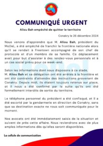 Le parti MoDel (Mouvement Démocratique Libéral) a déclaré jeudi dans un communiqué que son président Aliou Bah, président du MoDeL, « a été empêché de franchir la frontière nationale alors qu’il se rendait à Freetown accompagné de son chef de protocole et d’un membre de sa famille ».