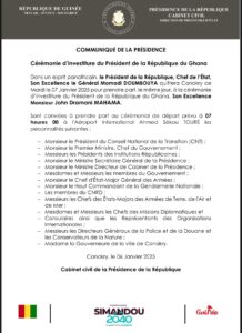 Le Président de la République, Chef de l’État, Son Excellence le Général Mamadi DOUMBOUYA quittera Conakry ce Mardi le 07 Janvier 2025 pour prendre part, le même jour, à la cérémonie d’investiture du Président de la République du Ghana, Son Excellence Monsieur John Dramani MAHAMA », renseigne la Présidence de la république dans un communiqué signé du cabinet civil. Ajoutant que le « cérémonial de départ prévu à 07 heures 00 à l’Aéroport International Ahmed Sékou TOURÉ ».