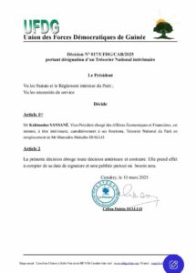 Mr Kalémodou YANSANÉ, Vice-Président chargé des Affaires Économiques et Financières, est nommé, à titre intérimaire, cumulativement à ses fonctions, Trésorier National du Parti en remplacement de Mr Mamadou Maladho DIALLO.