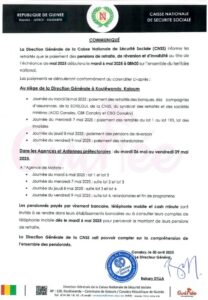 Journée du mardi 06 mai 2025 : paiement des retraités des banques, des compagnies d’assurances, de la SOTELGUI, de la CNSS, du syndicat des retraités et des sociétés minières (ACG Conakry, CBK Conakry et CBG Conakry)