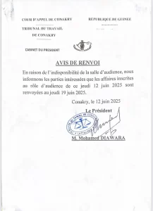 Les parties intéressées sont ainsi informées que les audiences prévues pour ce jeudi sont reportées d’une semaine, soit au jeudi 19 juin 2025.