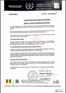 A travers un communiqué dont copie est parvenue à notre rédaction www.Mondemedia.info, le parquet général de la cour d’appel de Conakry rassure le Barreau de Guinée que toute la lumière sera faite sur l’enlèvement suivi de torture de Me Mohamed Traoré le samedi dernier. Cette communication fait suite à la réunion tenue ce matin par le Barreau d’une réunion, à l’issue de laquelle il a décidé de suspendre sa participation aux audiences pendant deux semaines.