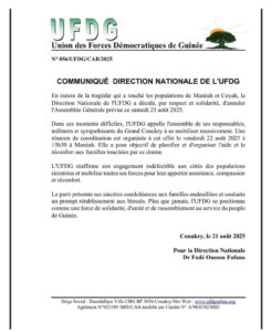 En raison de la tragédie qui a touché les populations de Manéah et Coyah, la Direction Nationale de l’UFDG a décidé, par respect et solidarité, d’annuler l’Assemblée Générale prévue ce samedi 23 août 2025.