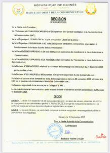 - La Haute Autorité de la Communication (HAC), dirigée par Boubacar Yacine Diallo, a annoncé, ce mercredi, 10 septembre, la levée de la suspension du site www.guineematin.com, en raison des excuses présentées à la HAC et de l’engagement de son administrateur général, M. Nouhou BALDE, à corriger les manquements relevés et à se conformer rigoureusement aux dispositions légales et règlementaires en vigueur.