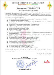 Le Président du Conseil National de la Transition (CNT), Dr Dansa Kourouma, a annoncé la tenue d’une séance plénière exceptionnelle ce vendredi 26 septembre 2025 à 18h00, dans l’hémicycle du Palais du peuple. Cette réunion cruciale aura pour objectif l’examen et la délibération du projet de Code électoral de la République de Guinée