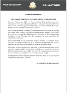 Ce Mardi, 9 décembre 2025 – Le Premier Ministre Amadou Oury BAH, a reçu à l’aéroport international Ahmed Sékou Touré, Son Excellence Monsieur Abdoulaye Maïga, Premier ministre de la République du Mali, arrivé ce matin à Conakry dans le cadre d’une visite de travail.