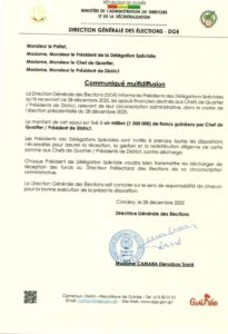 La Direction Générale des Élections (DGE) informe les Présidents des Délégations Spéciales qu’ils recevront ce 28 décembre 2025, les appuis financiers destinés aux Chefs de Quartier / Présidents de District, relevant de leur circonscription administrative, dans le cadre de l’élection présidentielle du 28 décembre 2025.